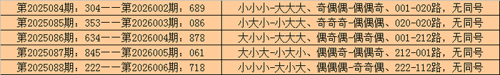 在陈列三历史开奖中,第2025084期-第2025088期不时5期奖号为:304-353-634-845-222。