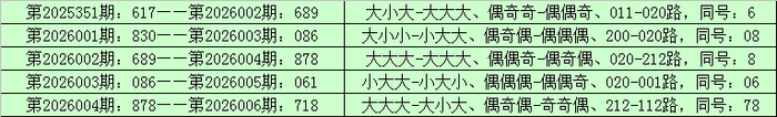 统计陈列三已开出的奖号发现,在不时5期(第2025351期-第2026004)奖号为:617-830-689-086-878。