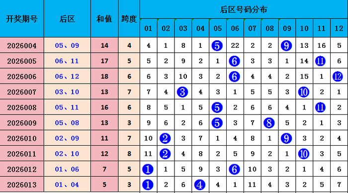 上期后区开出号码01 04,和值5,近十期和值14 17 18 13 16 13 11 12 7 5,和值波动规模较大,本期预测和值会高潮,要点热心号码:07 09,和值16。