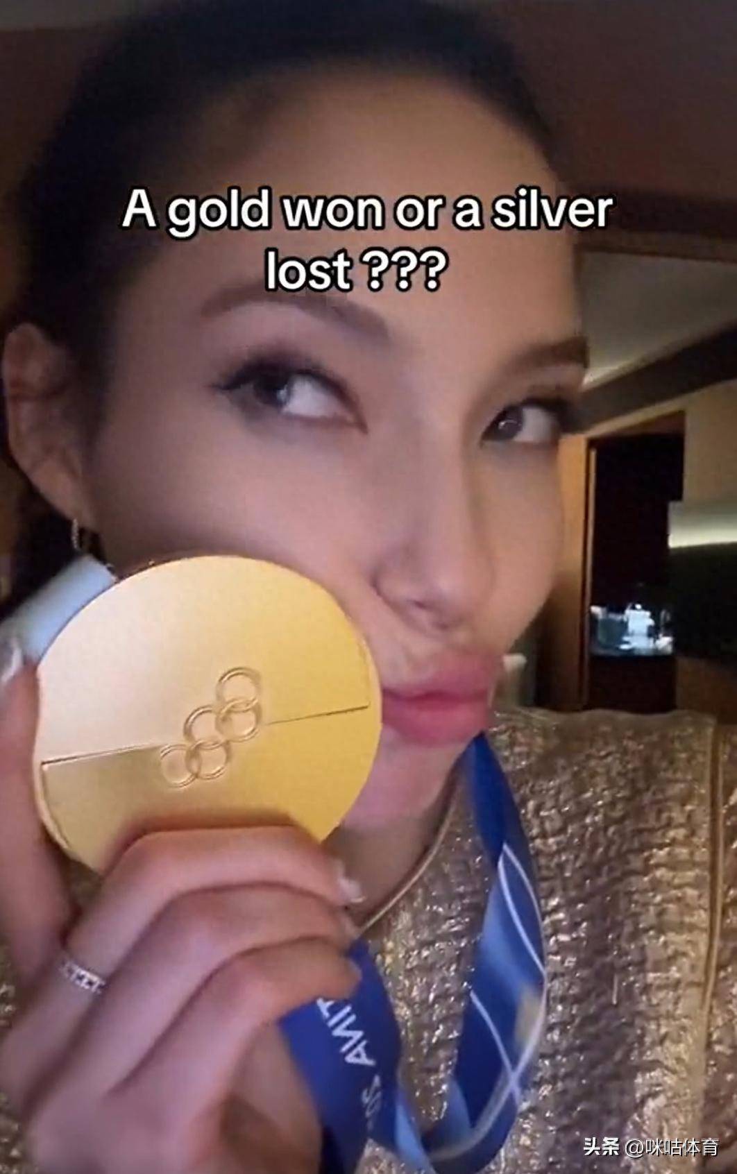 视频中,谷爱凌在晒出金牌的同期还配文:“a gold won or a silver lost?(赢得了金牌依然输掉了银牌?)”
